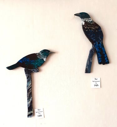 Various native birds on shaped wood-commissions available, Sizes are ususally lifesized.